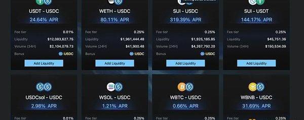 下图为当前Cetus上各池子的APR现状,目前Cetus对部分的池子有一定的额外Bonus激励,因此池中的APR收益为手续费收益+Bonus激励,所以目前各池的APR处于一个较高的水平。