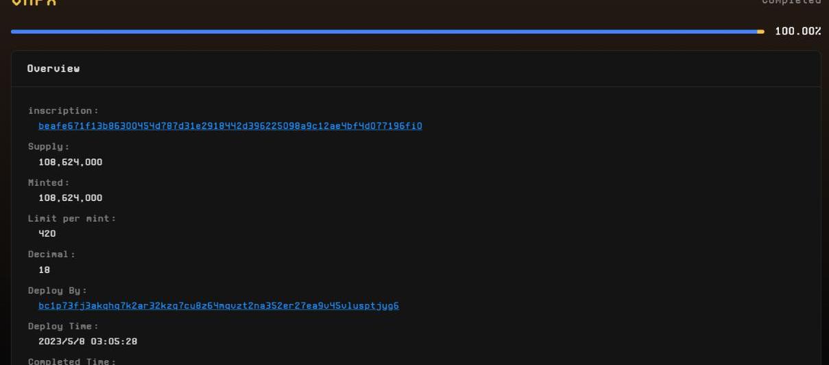 据悉,BRC-20协议是直接写到比特币网络上,以聪为载体,用OrdinalInscriptions的JSON数据部署、铸造和转移代币。Ordi是第一个比特币铭文代币,总供应量为2100万枚。[2023/5/3 14:39:34]