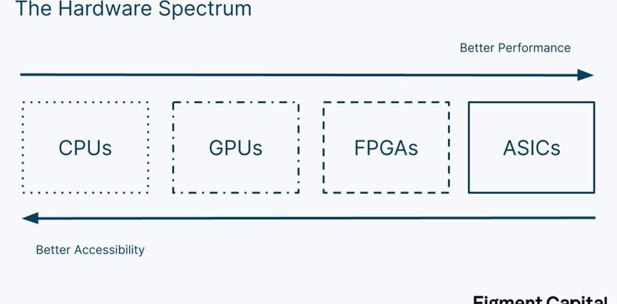 特定应用集成电路是为某一特定任务过度优化的定制设计芯片。与允许硬件重新编程的FPGA不同,ASIC的规格是根植于芯片中的,防止它们被重新利用。对于任何特定的任务,ASIC都是最强大和最节能的芯片。例如,比特币挖矿是由ASIC主导的,它计算的哈希值远远多于其他类型的芯片。