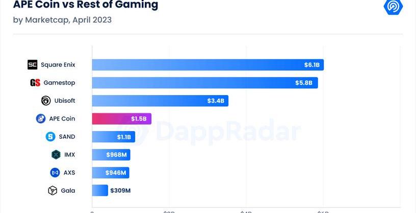 在撰写本文时,$APE的流通市值为14.8亿美元,成为了最有价值的游戏代币。换个角度来看,传统的Web2游戏公司,比如已经有几十年历史的育碧,市值只有34.6亿美元,SquareEnix也只有60亿美元。