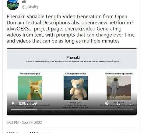 如果人工智能模型可以将文本转换为图像,那么它们可以将文本转换为视频吗?当然可以!10月份,一批从文本到视频的生成软件面市。Meta公司的Make-a-Video可以根据文本和静止图像生成视频,而谷歌大脑的Phenaki可以根据一系列构成故事的提示词生成一个连续视频。