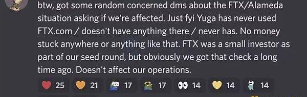 面对质疑,YugaLabs的联合创始人Garga11月11日在Discord中发言表示,整个加密市场都在关注FTX和SBF所引发的严重后果,但YugaLabs在FTX上没有任何资金。他写道:「顺便说一句,市场上有些人询问我们是否受到FTX/Alameda事件的影响,YugaLabs从来没有使用过FTX.com,在上面也没有任何资金和资产。虽然FTX是YugaLabs种子轮融资的一个小投资者,但很明显,我们很早以前就收到了他们的支票,这不会影响我们的运营。」