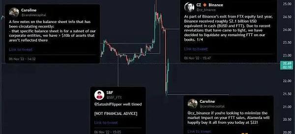 CZ突然表示,币安去年因退出FTX的一部分股权,收到约21亿美元等值的BUSD和FTT。由于最近曝光的消息,币安决定清算账面上的任何剩余FTT。币安将尝试以最小化市场影响的方式清算,由于市场条件和流动性有限,预计将需要几个月才能完成。FTT随之大跌。Caroline则临时回应,如果您希望FTT卖出对市场的影响降到最低,Alameda很乐意今天以22美元的价格从您这里购买。