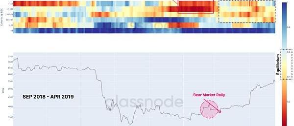 我们可以看到,大型主体,特别是持有1000-10000BTC的钱包,在2019年3月的低点反弹期间推动了抛售。散户在2018年和2019年大量增持。