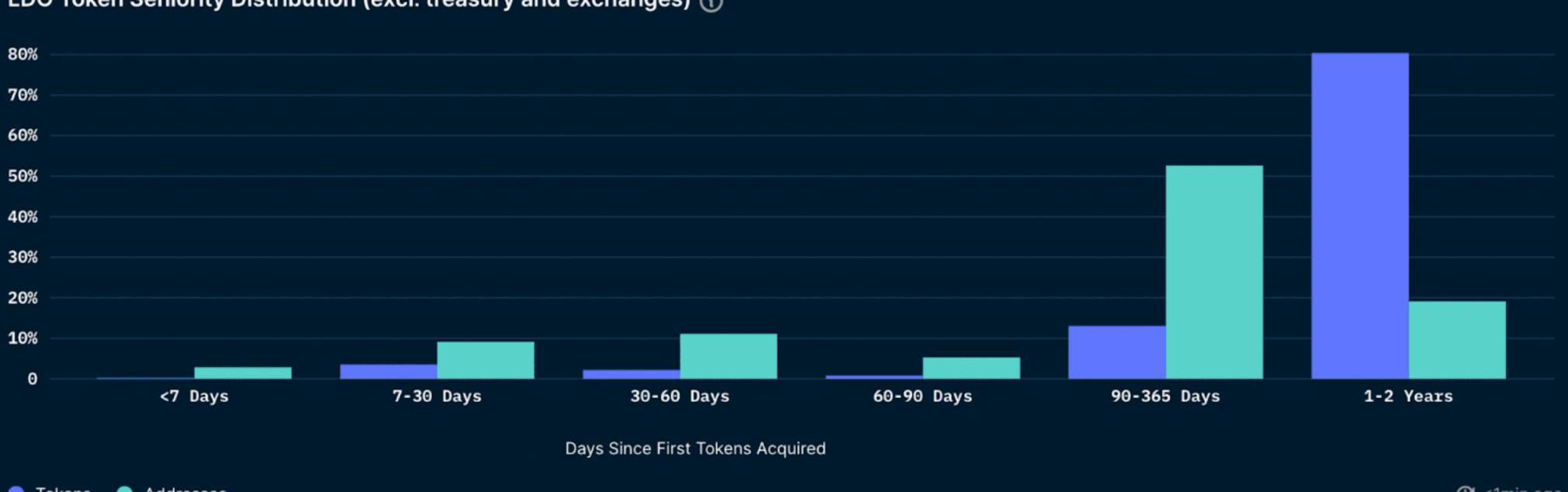上图还让我们更好地了解LDO代币持有者。超过81%的代币是在1-2年前获得的,这表明这些地址已经持有很长时间了。查看代币资历分布图,可以看到在30-60天和7-30天之间获得的代币略有上升。然而,这两种情况下的小幅上涨在流通中的整体LDO代币中所占的比例相对较小。