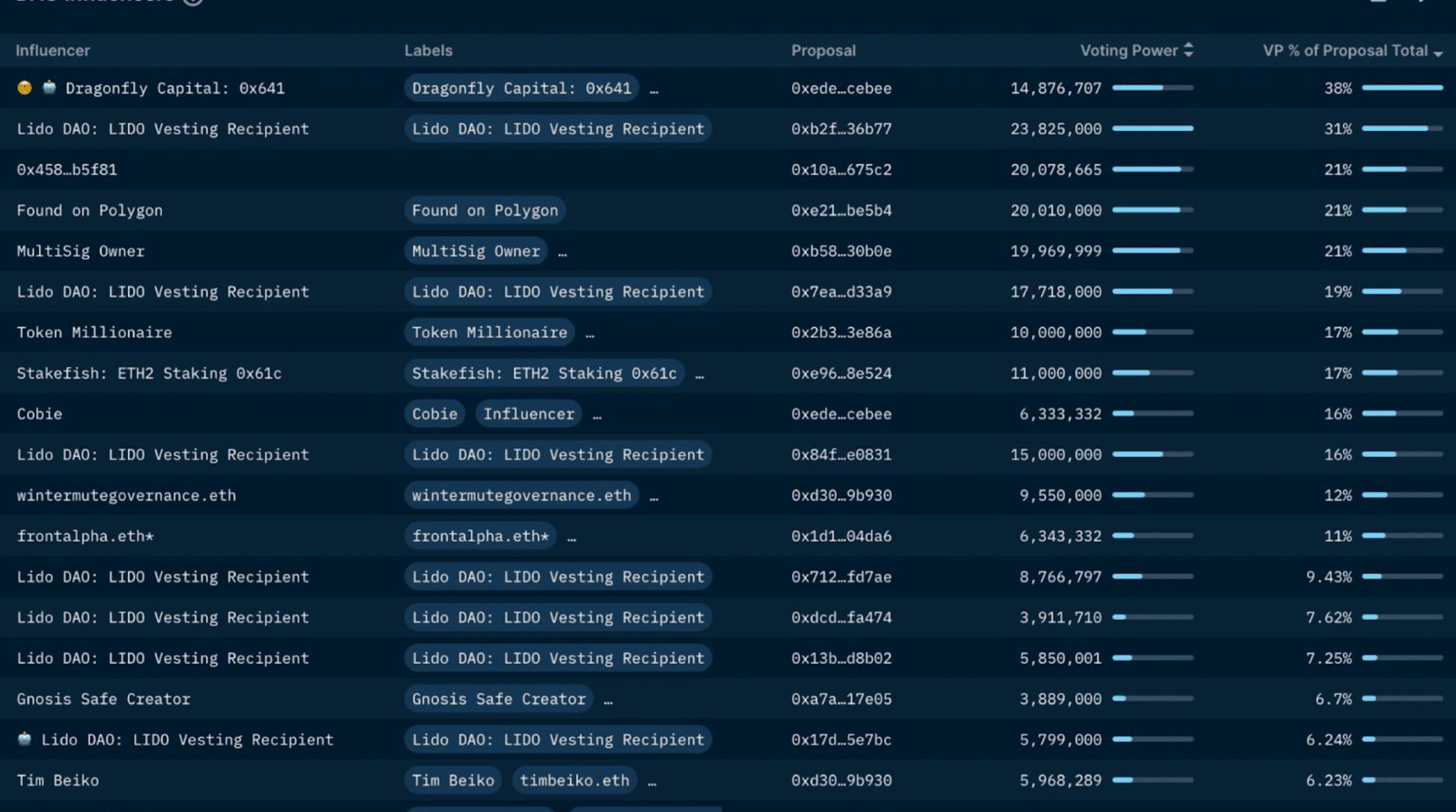 有趣的是,从历史上看,最多代币持有者并不是最大的影响者。影响者在提案中行使的最高投票权为2380万个代币,占一个提案中总投票权的31%。另一方面,钱包在提案中的最高影响力属于DragonflyCapital。该提案涉及将1%的LDO代币分配给DragonflyCapital,以换取总计14521530DAI。