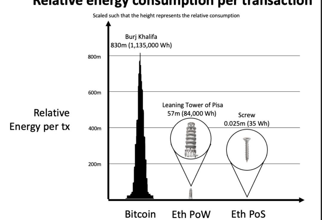 据了解,合并之后,以太坊网络的耗电量将减少99%以上。10万次Visa交易大概消耗149度电,相比之下,合并后的PoS以太坊网络进行10万次交易只消耗0.667度电。