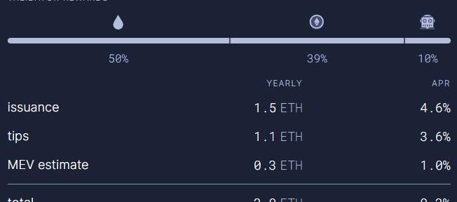 至于ETH质押奖励,目前总共有约1300万ETH被质押,一年释放大约58.4万ETH作为质押奖励。合并前后,质押奖励都分配给信标链上的验证者。