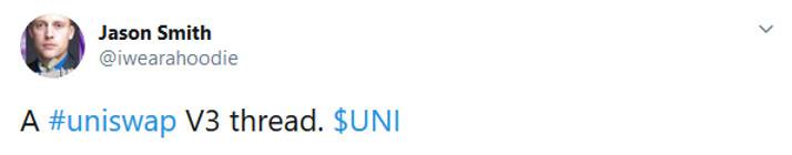 今年 5 月 V2 上线时,Adams 说「他已经在确定 V3 方案」。Smith 说 V3 可能会提早上线,但会在 UNI 推出之后,他说:「预计 V3 上线前会推出代币,所以 V3 在即……」