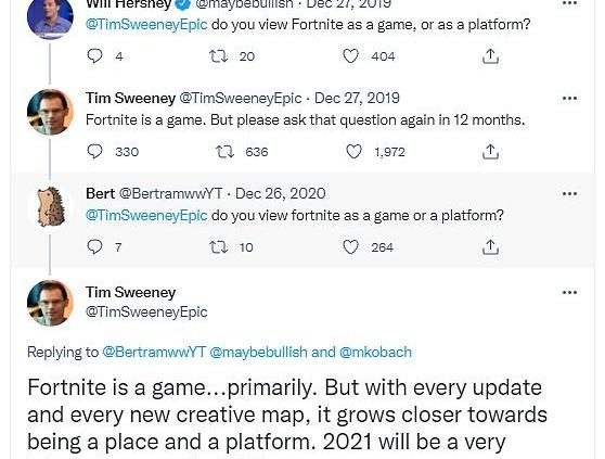 《堡垒之夜》游戏发行商EpicGames的创始人兼CEOTimSweeney回复道:“《堡垒之夜》主要是一款游戏。但随着每一次更新和每一张创意地图,它越来越接近成为一个平台。2021年将是非常有趣的一年。”?