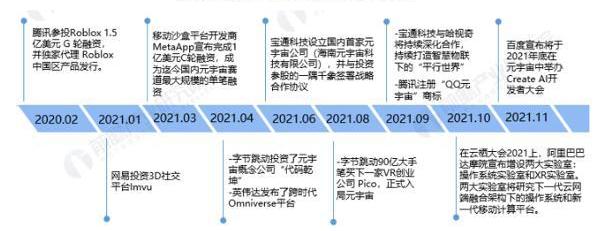 国内较早布局元宇宙业务的公司包括腾讯、网易、字节跳动等。早在2020年初,腾讯便已参投Roblox1.5亿美元G轮融资,并独家代理Roblox中国区产品发行。字节跳动分别于2021年4月和6月投资了元宇宙概念公司"代码乾坤"和买下Pico。2021年11月,百度更是宣布将于年底在元宇宙中举办CreateAI开发者大会。