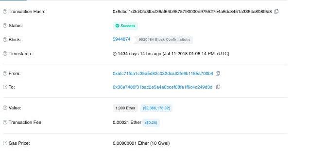 2、2018年7月11日流出2,000ETH??:区块链链上纪录显示,该笔交易已被czhang.eth(CzhangLin)收到。林先生在宝岛金融担任顾问一职,直至6月22日。