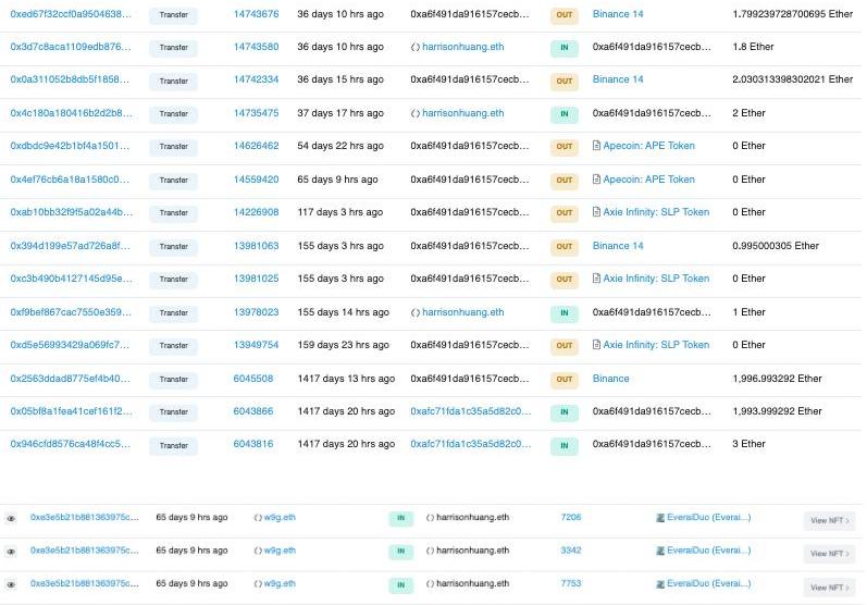 3、?1,997ETH于2018年7月28日流出:唯一流入该Binance帐户的资金来自harrisonhuang.eth,该帐户与w9g.eth频繁互动,密银工程副总裁,现任XYFinance和GalaXYKats的创办人。