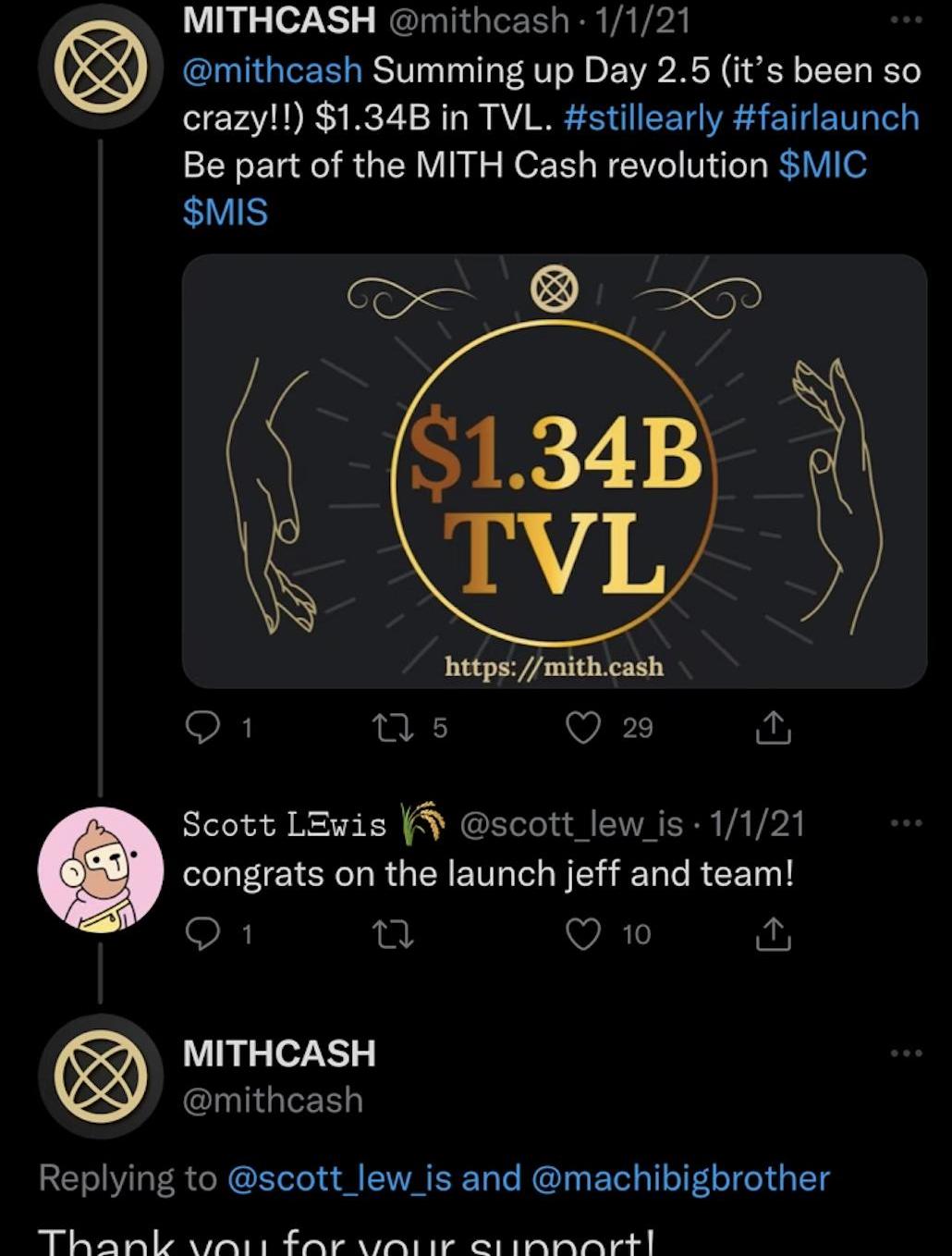 2020年12月30日,黄立成和秘银带着一个新项目回来了:MithCash,这是BasisCash协议的一个分叉项目。推出仅几天后,MithCash的总所仓价值就增长到10亿美元,后又随着Token持有者兑现他们的奖励,价格猛然崩盘。MithCash最终遭遇了与BasisCash相同的命运。与黄立成的其他项目类似,该团队是「匿名的」,黄立成声称他只是一名顾问。
