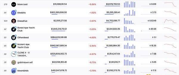 4.BAYC、Azuki等蓝筹NFT地板价24小时跌幅均超20%