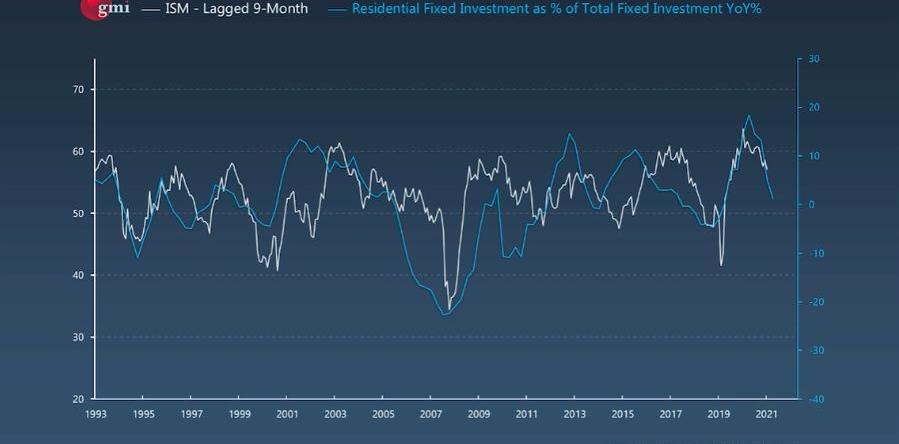 下面这张图是住宅固定投资占总固定投资的百分比。新冠期间,大部分人都被困在家里,于是我们开始装修自己的房子,换掉老旧的家具。这也提高了住宅固定投资的比例,从而带高了ISM指数。然而,现在这种增长正在回落,且多个前瞻性指数都印证了这一点。