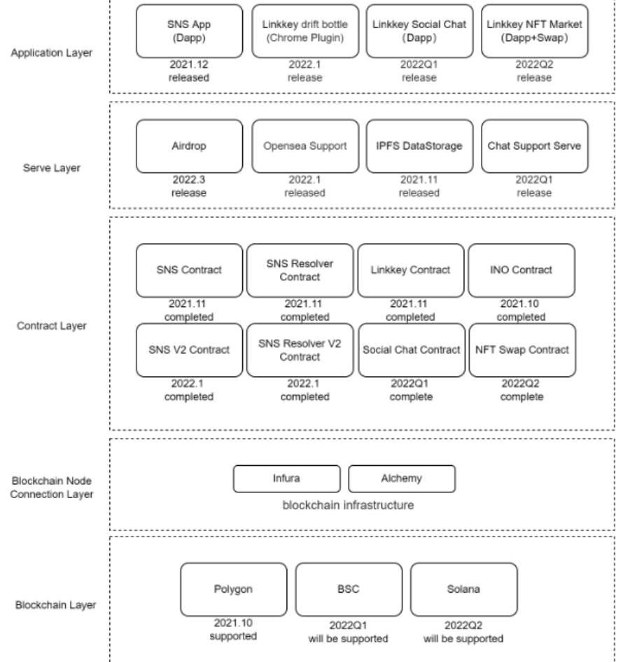 Linkkey将首先部署在Polygon链上,并在未来兼容BSC、Solana等更多生态。目前,SNS域名合约仍然基于以太坊ERC-721标准构建,KEYToken则采用ERC-20标准。此外,Linkkey生态系统中的数据会使用IPFS协议进行永久存储。