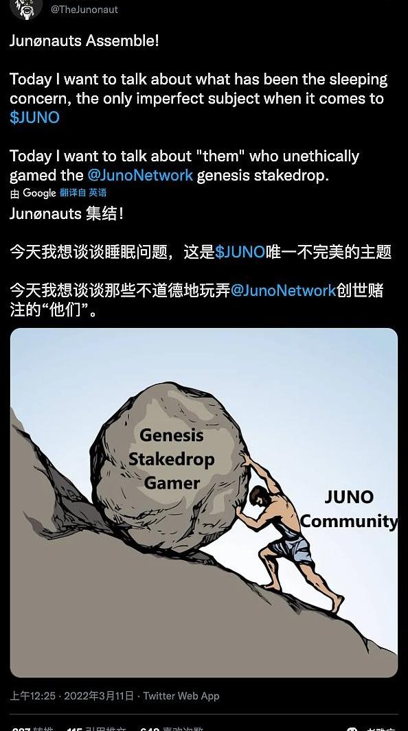3月10日,该项目的一个社区提案被提交,如果成功的话,将夺走“鲸鱼”的大部分代币,而留给他们的是5万$JUNO代币,这原本是每个人的上限。虽然代币留在一个人身上的影响很严重,但投票通过也会使"yourkeys,yourcoins"的价值观在生态系统中产生重大的负面影响,也就是说,如果你控制了钱包的钥匙,你的资产就不能被夺走。这有背Web3精神。