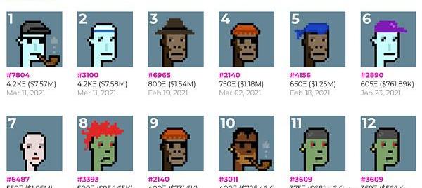 cryptoslam显示排名第二的CryptoPunks,CryptoPunks于2017年6月首次推出,由美国游戏工作室LarvaLabs的MattHall和JohnWatkinson的两人团队开发。它们是通过算法生成的24×24像素艺术图像。CryptoPunks在CryptoKitties之前发布。他们是NFT领域的创新者,ERC-721代币的灵感来源之一,与ERC-20代币不同,它们都是独一无二的。