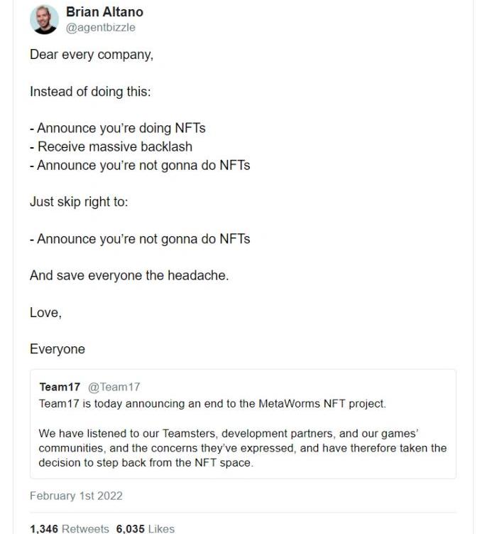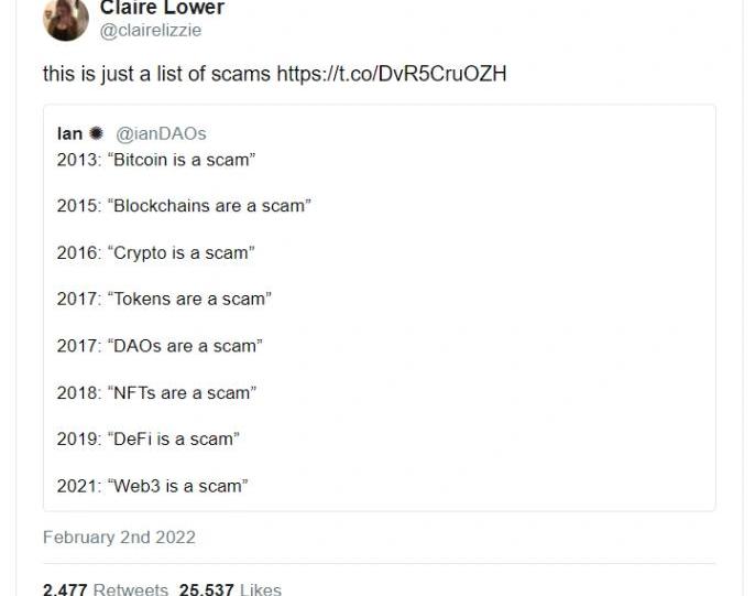 我认为这个问题对大多数人来说是非常明显的--不同项目的分裂,对品牌推出加密整合的诋毁,对cryptobro角色的解释,当然,还有任何NFT推特下的一般氛围。