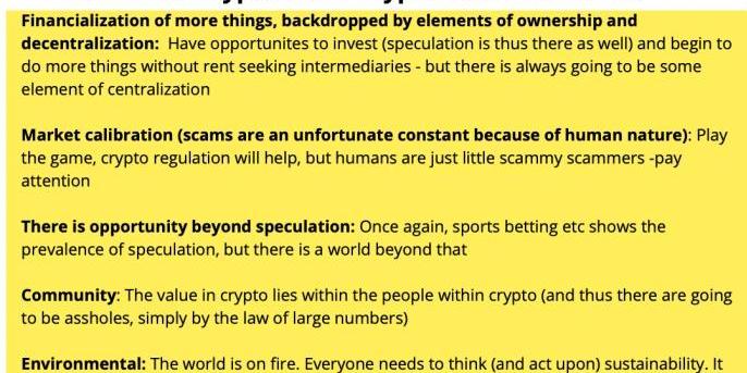 当然,Crypto并不完全是这样的。在我们进入这一部分之前,非常重要的是要强调Crypto有不同的部分。(1)有些人从字面上看只是为了钱,其他人为了技术的真实世界的使用案例。Crypto认为的5点叙事更像是: