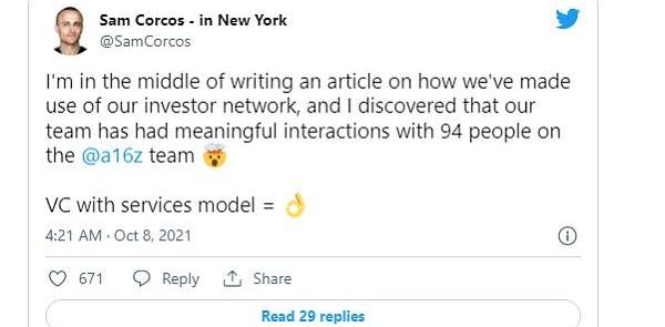 一些创始人肯定会。a16z可能是在投后支持方面最先进的公司。对于像Levels的SamCorcos这样的创始人来说,这是一个巨大的福音。去年10月,他在推特上表明了该公司的价值: