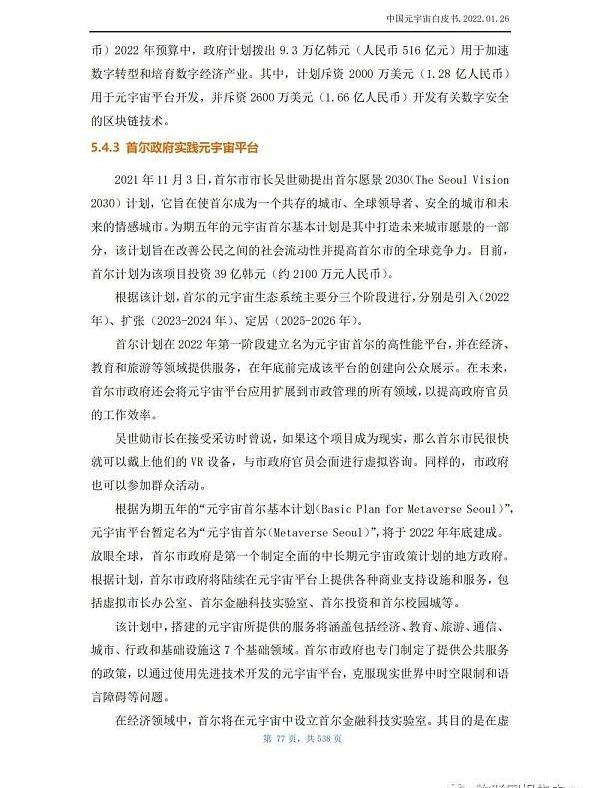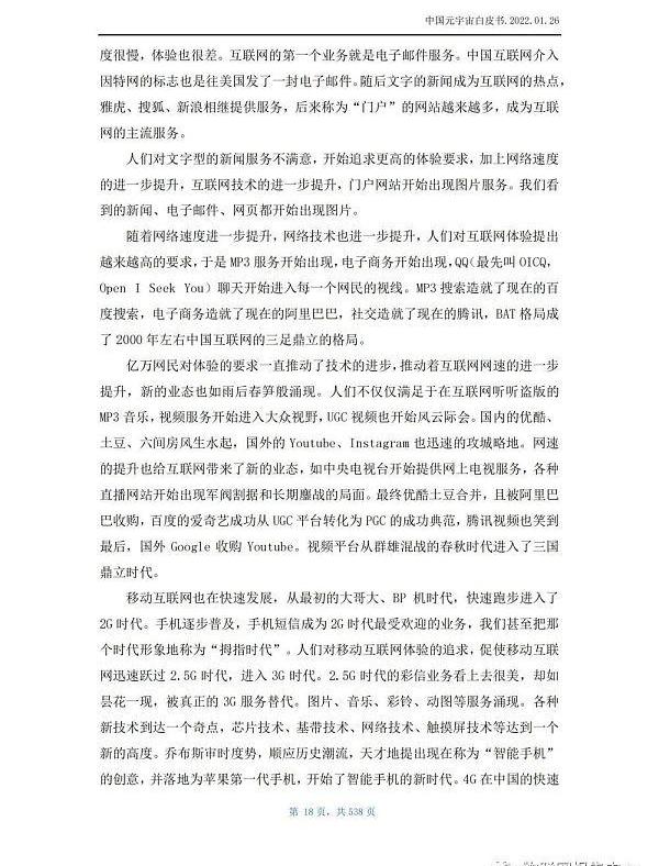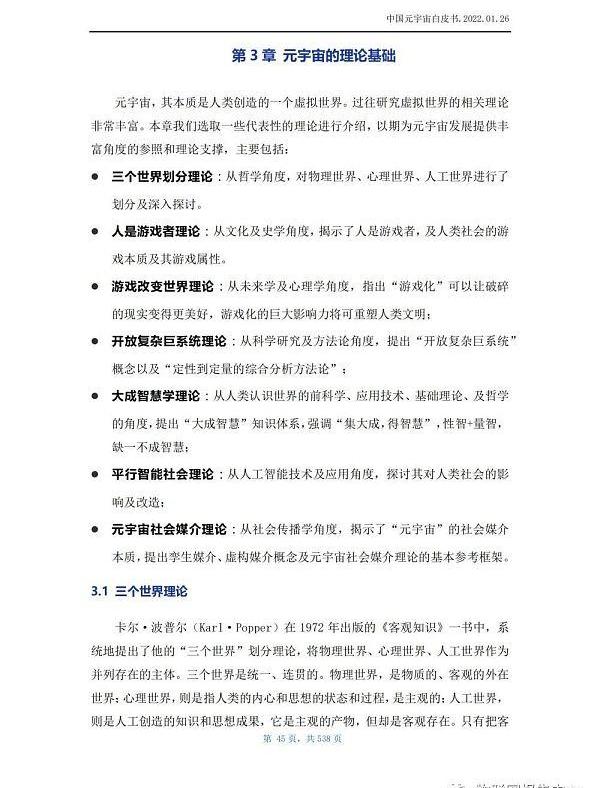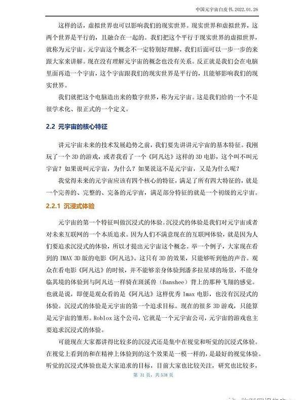 近日,2022《中国元宇宙白皮书》在北京中关村正式全网发布。该白皮书由国科创新研究院首席科学家,中关村数字媒体产业联盟常务副秘书长,中关村数字媒体产业联盟元宇宙实验室执行主任龚才春主编。由北京信息产业协会、中关村数字媒体产业联盟、中国科技新闻学会大数据与科技传播专业委员会等组织起草。该白皮书分为缘起篇、现状篇、技术篇、产业篇、法律与监管篇、伦理与风险篇、经济篇、人才篇、畅想篇这九个篇章,从元宇宙的缘起、发展现状、技术支持、相关产业等方面进行了全面、深入、细致的分析、总结和畅想。白皮书全本PDF电子版538页。