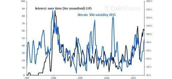 谷歌趋势(GoogleTrends)最近对“加密货币监管”一词的搜索突显出,人们对加密货币监管的兴趣达到顶峰是在2018年之前的高波动性和价格暴跌期间。今天我们没有看到像2018年那样波动率达到170%的高位,现在波动率接近100%。尽管这一次投资者的采用率要大得多,2021年投资产品的净新增资产目前总计55亿美元(2017年末为5亿美元),但这可能是监管审查再次加强的主要原因。