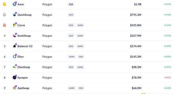 Polygon链上DeFi锁定资产前十排名及锁仓量,数据来源:Debank