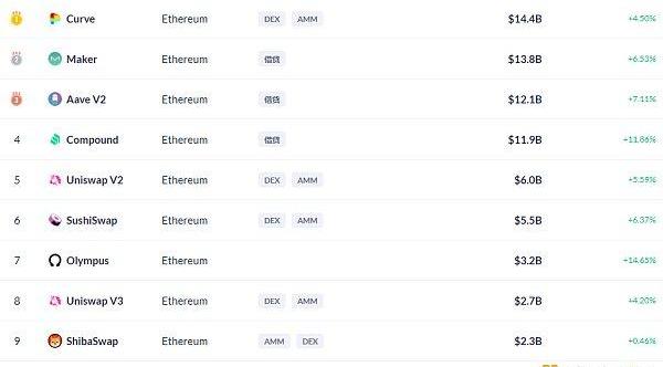 Ethereum链上DeFi锁定资产前十排名及锁仓量,数据来源:Debank