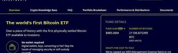 据PurposeInvestmentsInc.官网信息显示,截至2021年9月21日,其比特币ETF产品管理的比特币数量已经超过2.1万枚,当前总价值达到8.85亿美元。