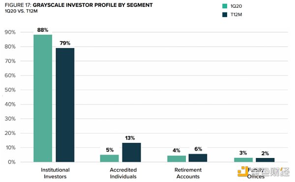 很多人都很疑惑灰度基金的高溢价来源于何处,往往根据市场经验得出人傻钱多的结论。事实上,如果仔细分析会发现上述结论并不能站住脚。根据灰度资产一季度报告显示,有88%的投资者为机构投资者,5%的高净值合格投资者,这些投资群体的用户画像很难与“人傻钱多”相匹配。