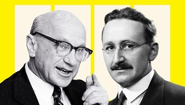 20世纪两位最杰出的经济学家:米尔顿·弗里德曼(左)和弗里德里希·哈耶克(右)
