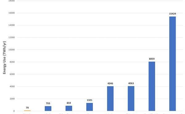 使用上述比率,以及2020年部门总能源使用量为118quadBTU,即34,582TWh,我们得到以下结果: