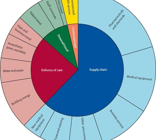 2020年9月《欧洲公共卫生杂志》上一篇被广泛引用的文章《医疗保健的气候足迹:卫生部门的贡献和行动机会》表明,在全球范围内,医疗保健的气候足迹相当于全球净收入的4.4%。排放量,基于来自43个国家的详细数据,其中包括美国、欧盟和中国这三大排放国,它们占医疗保健总足迹的一半以上。4.4%的数字当然是平均值,柳叶刀医生根据数据分析指出,医疗保健仅占英国排放量的3%,但在美国占10%,在澳大利亚占7%。