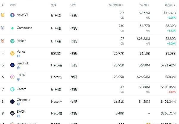 锁仓量排名前十的借贷平台排名来源:DeFibox