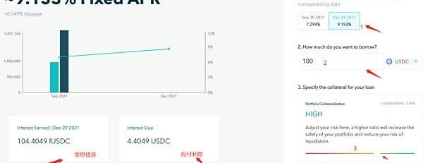 对于借款人来说:设定到期日、借款数量、抵押资产以及抵押率,这时候协议会算出你的应付利息以及到期后需要偿付的零息债券fUSDC。
