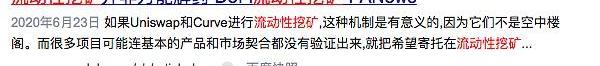 随着Fomo情绪推动至高潮,当时的一些理性派也表达了自己的观点。他们认为:虽然我们认为DeFi确实能带起一轮局部性小牛市,甚至有可能成为下一轮大牛市的启动引擎,但是也就仅此而已了。想要寄希望于DeFi来改造、革新乃至颠覆金融行业,目前道路尚远,修行尚浅。且文中已经客观的分析了DeFi所面临的性能瓶颈、安全风险以及CeFi阻隔等现阶段依然面临的问题。更直白的批评声音称DeFi就是套利游戏,演绎了人性的贪婪和资本永不眠。
