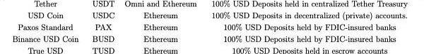 当我们着眼于稳定币目前的情况时,我们可以根据它们使用的抵押品来拆分它们。例如,像USDT这样的稳定币在“Tether金库”中,而USDC在去中心化的私人账户中。两者都几乎是自我调节的,他们需要对这些组织有高度的信任。其他稳定币,如Pax和BUSD是通过FDIC保险的银行进行抵押的。