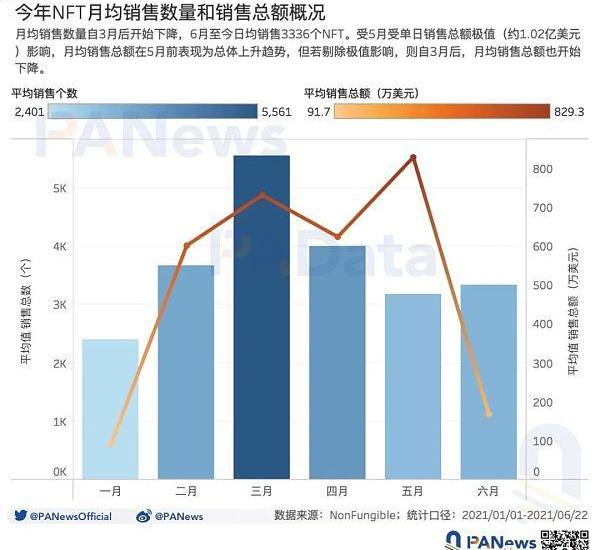 1)今年NFT月均销售数量自3月后开始下降,6月略有回升。剔除极值影响,月均销售总额也自3月后开始下降,6月至今日均销售总额已下降至169万美元,月环比跌幅超67%。