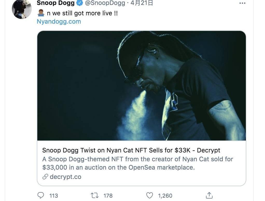 无独有偶,另一位著名说唱歌手SnoopDogg与彩虹猫原作者ChrisTorres也于近期合作发行了NFT收藏品。