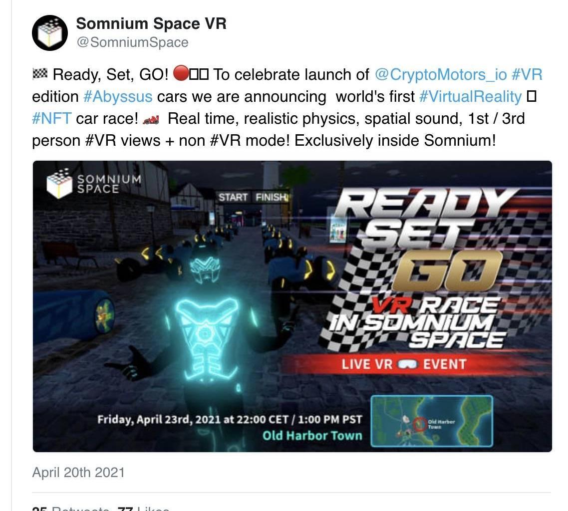 4、SomniumSpace将举办首次VRNFT赛车比赛。