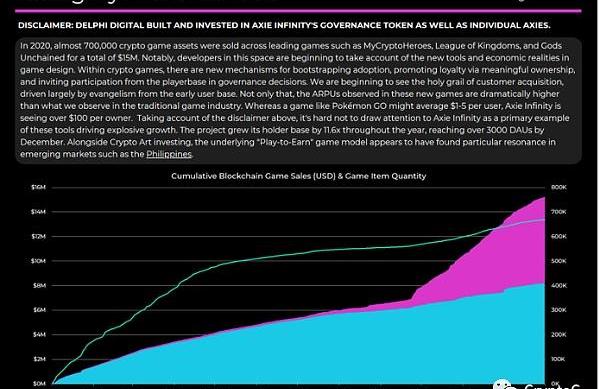 AxieInfinity是一款以《精灵宝可梦》为灵感的数字宠物游戏,允许用户进行交易、繁殖、战斗,甚至开发虚拟房地产。(免责声明:德尔福数字公司建造并投资了他们的代币)。在稳健的经济支柱和热情的用户基础共同推动下,它似乎正在进入抛物线增长阶段。Axie可能是我们最好的游戏例子,展示了加密经济学的力量——引流用户(2020年用户基数增长了11.6倍)、提高忠诚度并为推广游戏提供正确的激励结构。