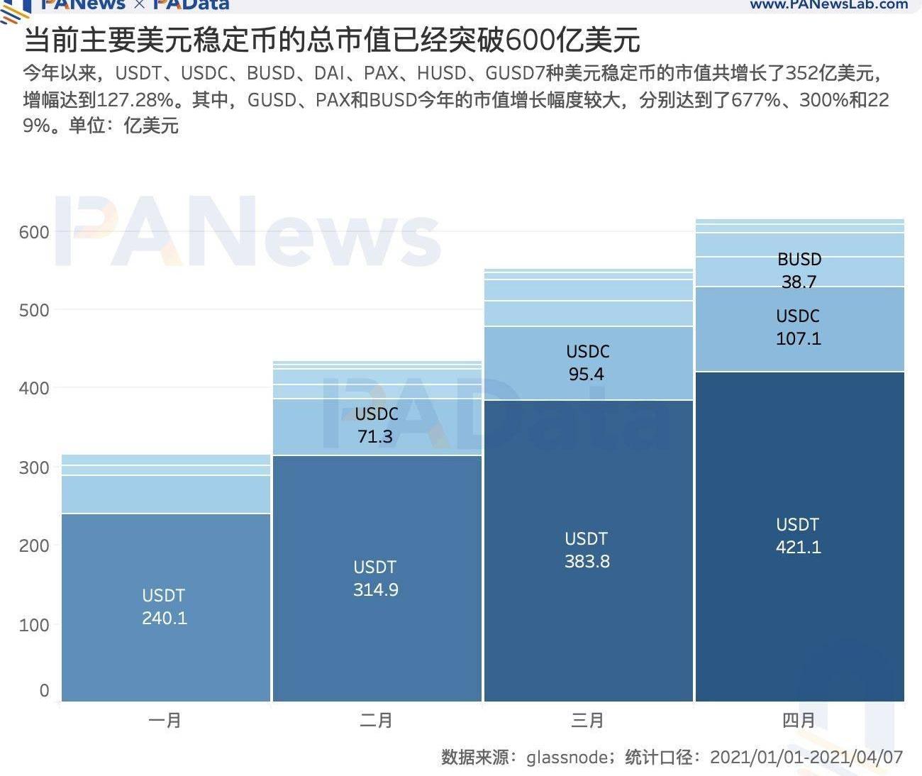 截至4月7日,USDT、USDC、BUSD、DAI、PAX、HUSD、GUSD七种美元稳定币的总市值已经达到了629.1亿美元。4月平均市值约为617.3亿美元,较今年1月的平均市值增长了92.31%,较去年4月的平均市值同比增长了712.24%,也即相当于翻了8倍左右。可见,美元稳定币在近期已经实现了高速大规模扩张,而且这种扩张趋势还在持续。