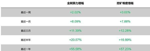 Bitcoin.com数据显示,截至2021年4月12日,全网平均算力增长至167EH/s,4月中上旬最高触及170EH/s,创历史新高。最近一周、最近一月、最近三月、最近半年和最近一年的全网平均算力分别增长2.02%、、8.09%、11.39%、20.57%、55.58%,且算力增长的趋势还在延续,从挖矿难度的调整也能得出相同的结论。
