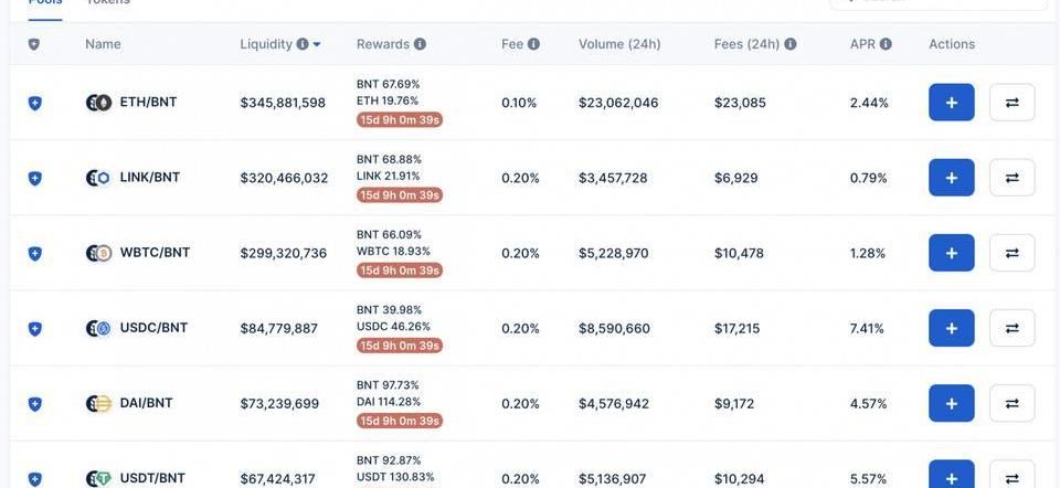 2.流动性保险:无常损失保险使得用户在Bancor上提供代币流动性时除了能够享有交易费率分成收益以外,协议还能弥补用户遇到的任何无常损失,但必须满足以下条件才能100%获得无常损失的保险理赔。目前,只有进入官方白名单的代币才能享有无常损失保险,用户可以在Bancor网站直接查看,有蓝色盾牌的资金池都能享有无常损失的保障。
