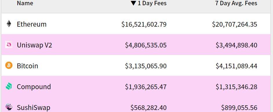 据数据追踪网站CryptoFees的数据,Uniswap在过去24小时内产生了超过480万美元的费用。而同期,比特币网络产生的费用仅为310万美元,按照每日产生的总费用排名,Uniswap超过了比特币,排在第二位。