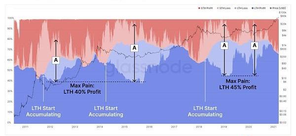 在A阶段,只有40%到45%的LTH币处于盈利状态,这代表着最大的痛苦,直到触底发生。