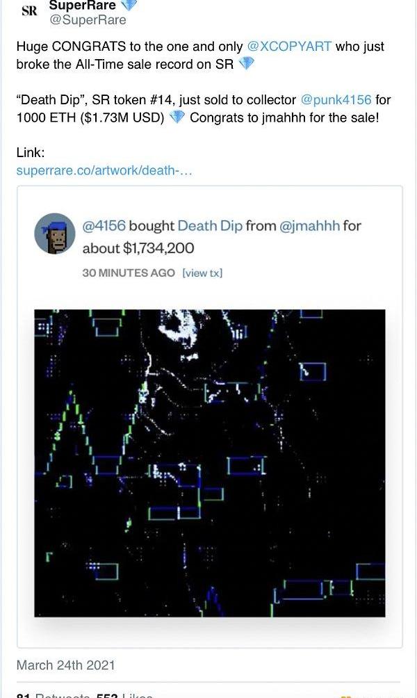 在SuperRare平台的二级市场,著名加密艺术家XCOPY的《DeathDrip》作品拍出了1000ETH的天价!创下该平台目前的拍卖纪录!
